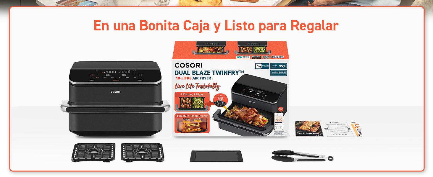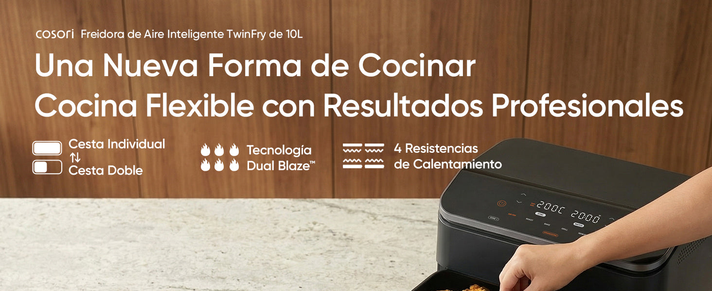 - 【𝐀𝐥𝐭𝐚 𝐓𝐞𝐜𝐧𝐨𝐥𝐨𝐠í𝐚 𝐜𝐨𝐧 𝐑𝐞𝐬𝐮𝐥𝐭𝐚𝐝𝐨𝐬 𝐒𝐮𝐩𝐞𝐫𝐢𝐨𝐫𝐞𝐬】La tecnología Dual Blaze en la COSORI Dual Blaze TwinFry calienta por arriba y por abajo para resultados más uniformes, sin necesidad de precalentar ni estar volteando. Control preciso de 35-240 °C.