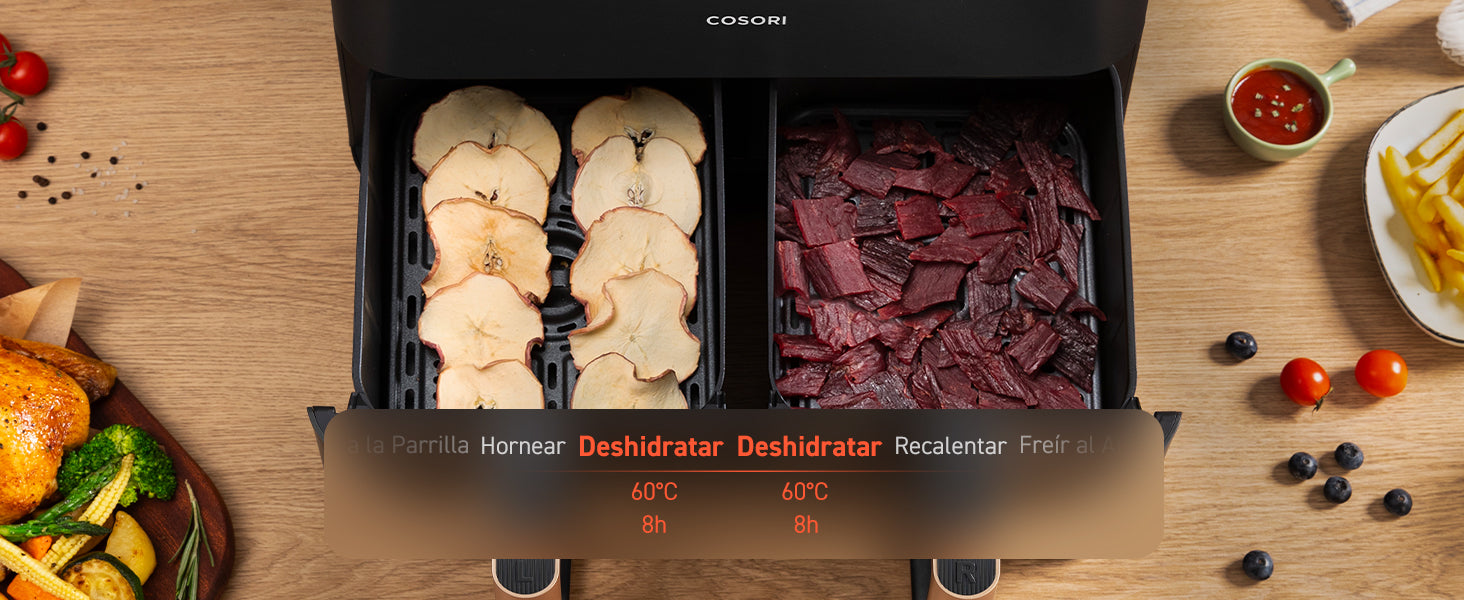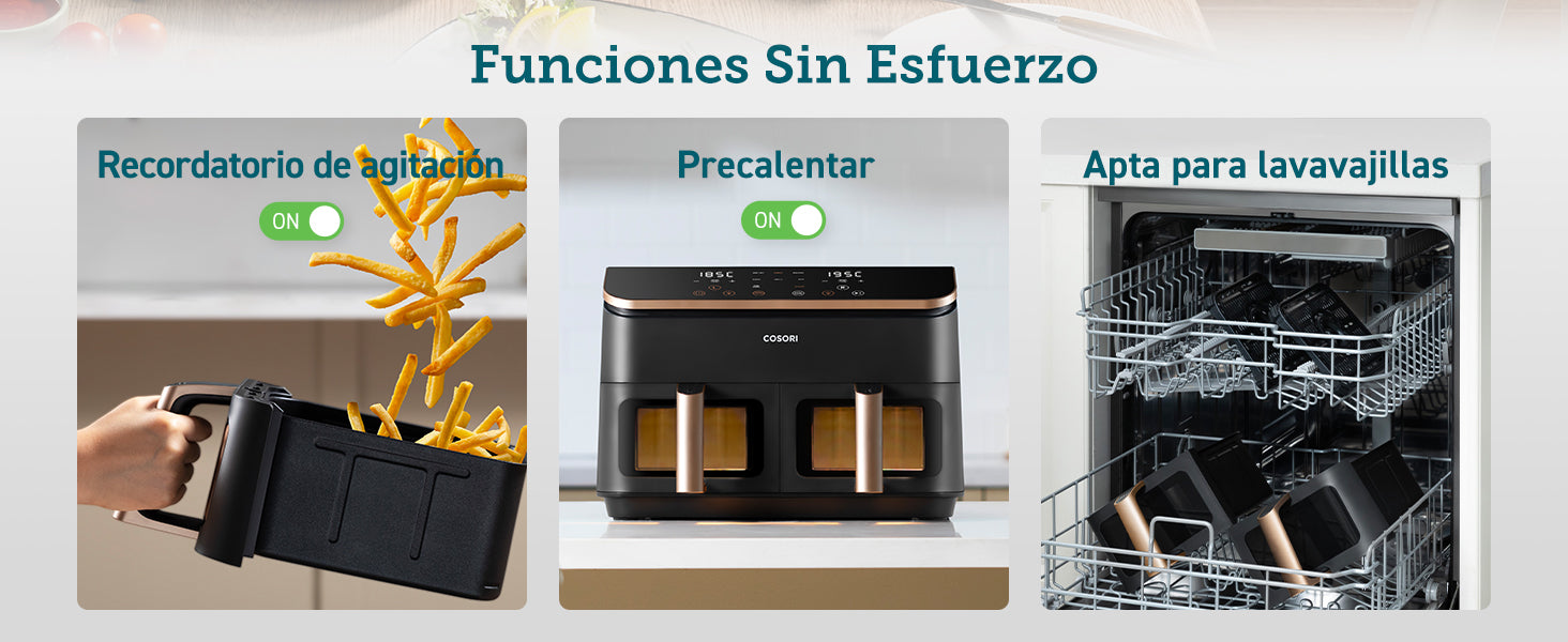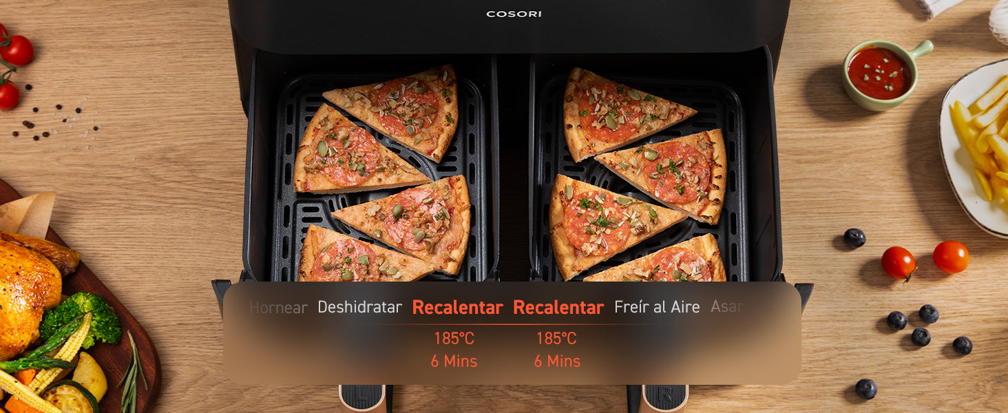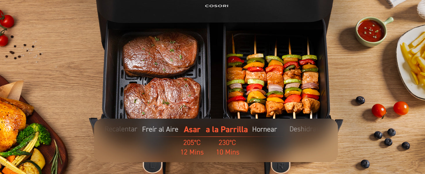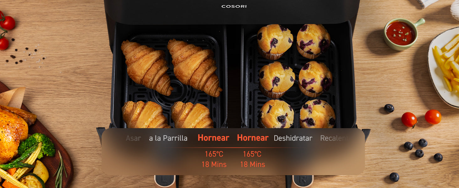 - [ 𝗖𝗼𝗰𝗶𝗻𝗮𝗿 𝗖𝗼𝗺𝗶𝗱𝗮𝘀 𝗕𝗮𝗹𝗮𝗻𝗰𝗲𝗮𝗱𝗮𝘀 𝗮 𝗹𝗮 𝗩𝗲𝘇 ] Cestas duales con control de temperatura independiente, permite preparar 2 platos al mismo tiempo; operar fácilmente con un toque, sincroniza los ajustes de cocción.